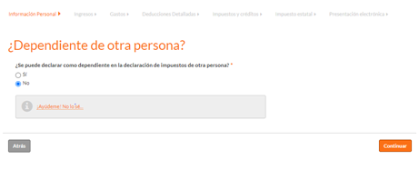 Debes compartir si otra persona te puede declarar como su dependiente. Si no estás seguro, haz clic en la frase “¡Ayúdeme! No lo sé”, en donde te guiarán en los requisitos que debes cumplir para esto.
