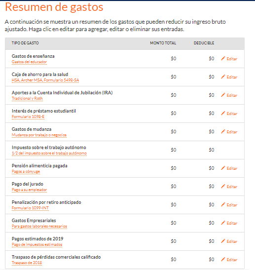Aparecerá la lista con las deducciones detalladas, todas con $0 porque no reportaste ingresos ni gastos, y eso es correcto. Haz clic en “Continuar”.