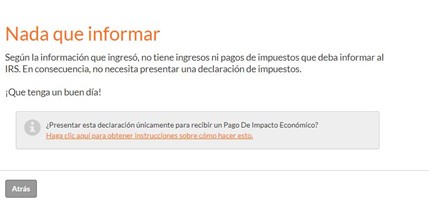 - No presentaste una declaración de impuestos federal de 2018 o 2019 Y no estás obligado a presentar declaración de 2019. No necesitas declarar si es que: