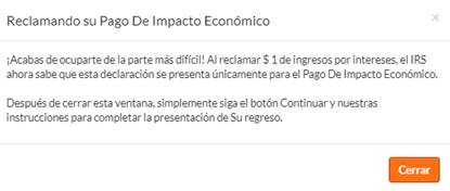 Te aparece esta pantalla con los pasos que el sistema está haciendo para que puedas solicitar el Pago de Impacto Económico. Haz clic en “Cerrar”.
