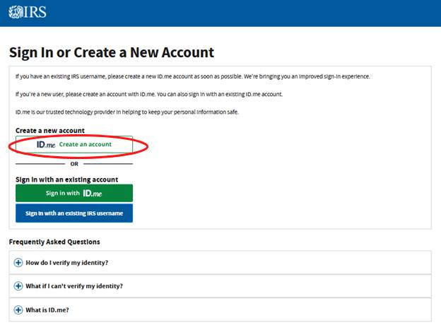 If you don’t have an existing IRS username, you will need to create a new account. Click the white “ID.me: Create an account” button.