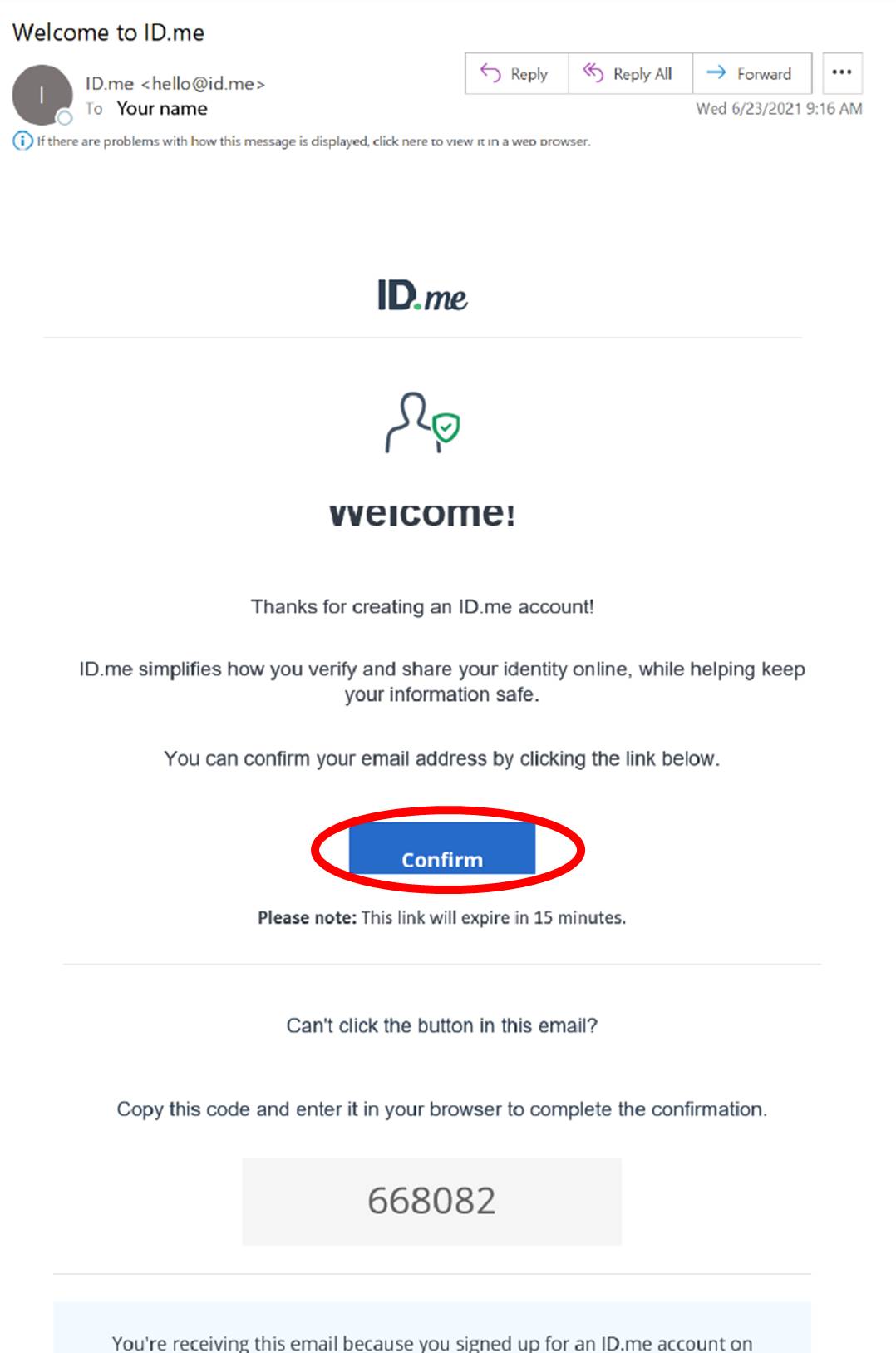 You will be sent an email from the sender “ID.me” with the subject line “Welcome to ID.me.” Click the blue “Confirm” button to confirm your email address.