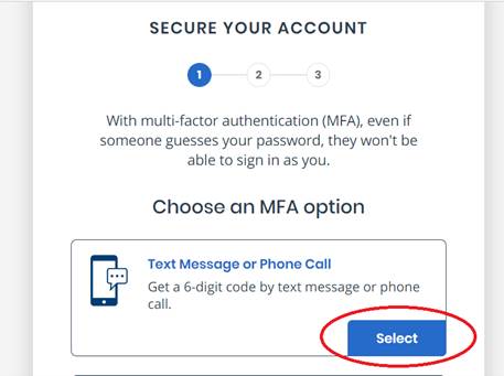 For this guide, to secure your account, we will use the text or phone call option. Press the blue “Select” button for “Text Message or Phone Call.”