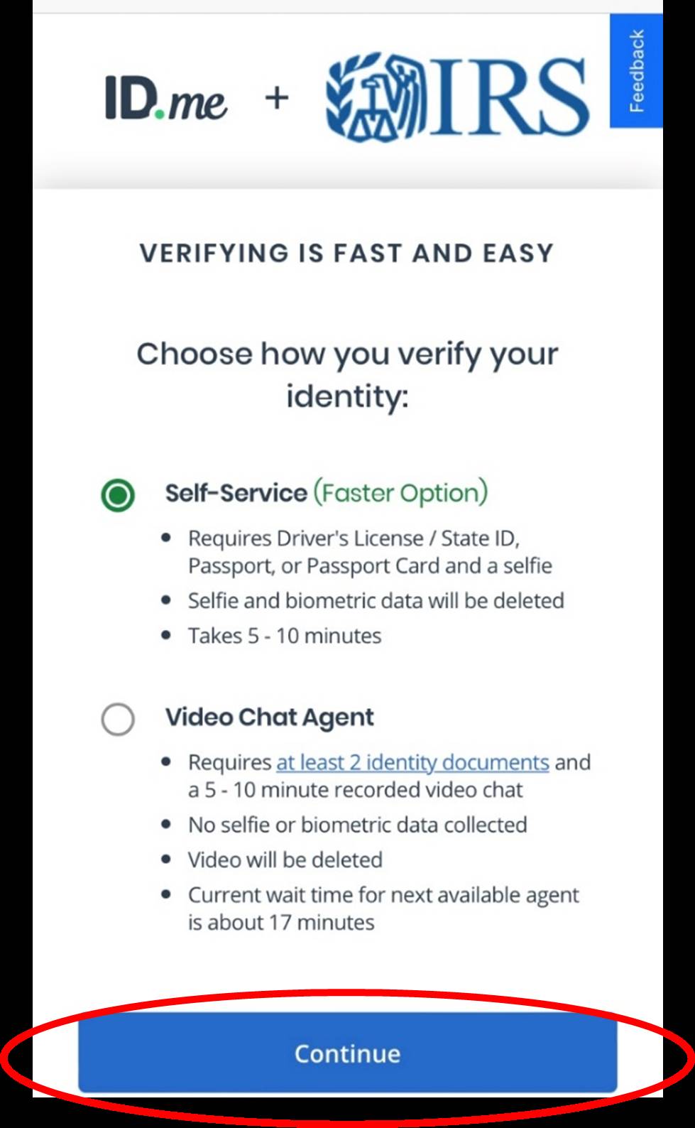 There are two options to verify your identity: self-service or through a video chat agent.