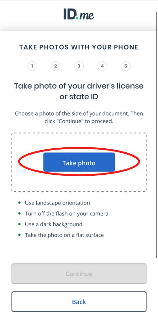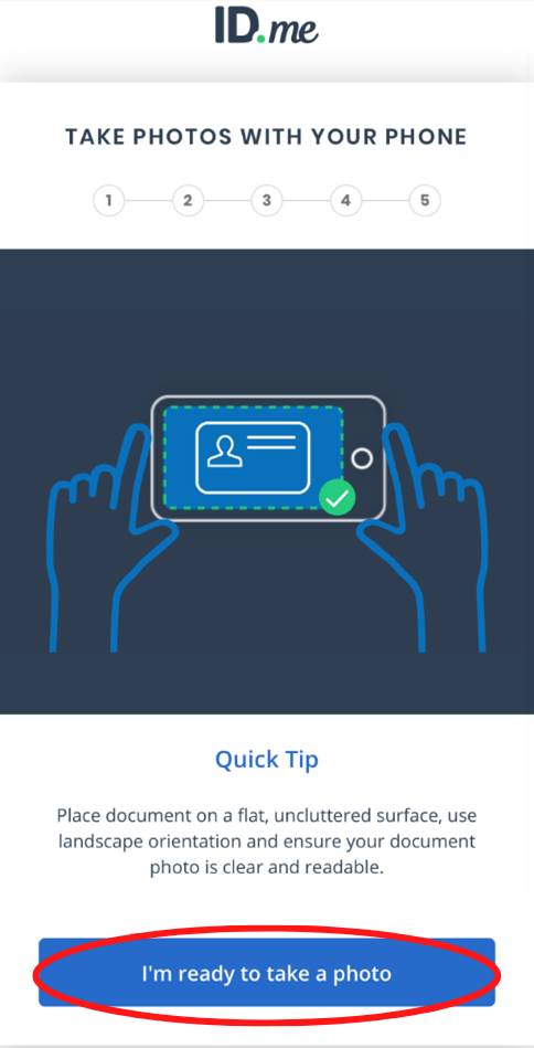 The next screen will ask you to take a picture of your ID. Have your driver’s license or state ID ready to photograph. Click the blue “I’m ready to take a photo” button.