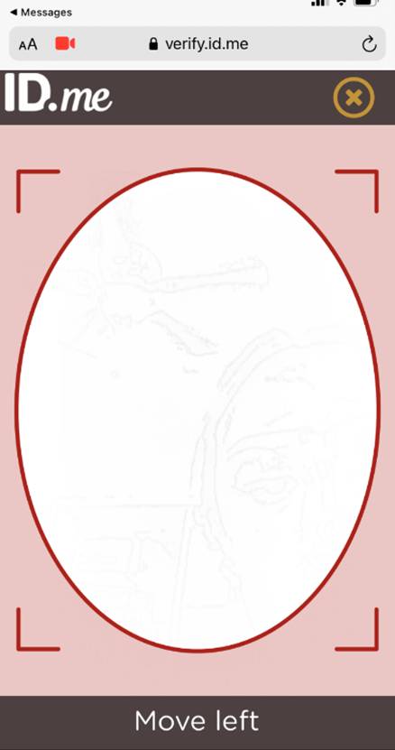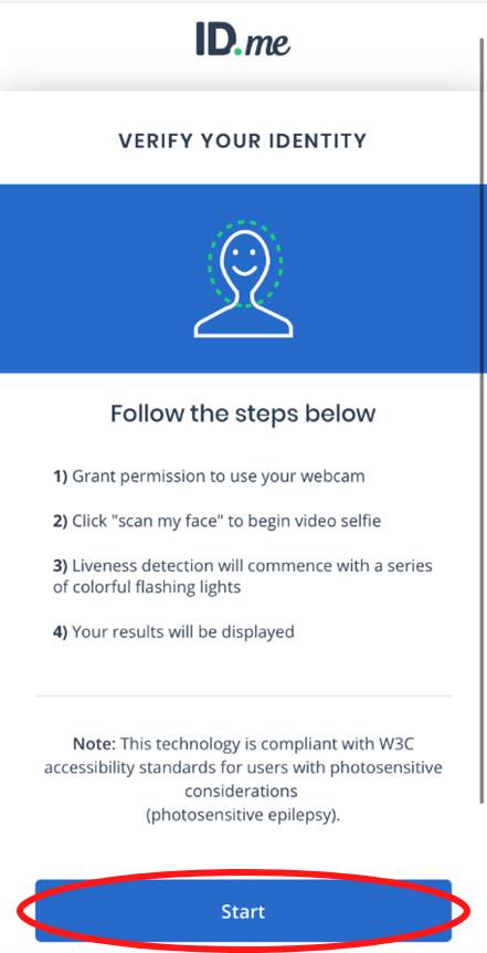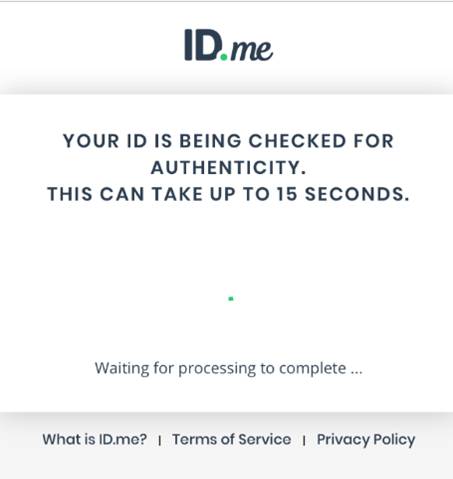 The scan will be a short video with several colorful flashing lights. Make sure there is good lighting and your face and head are uncovered to match how you appear on your ID. Stay still and wait for the video to complete. ID.me will then process your selfie.