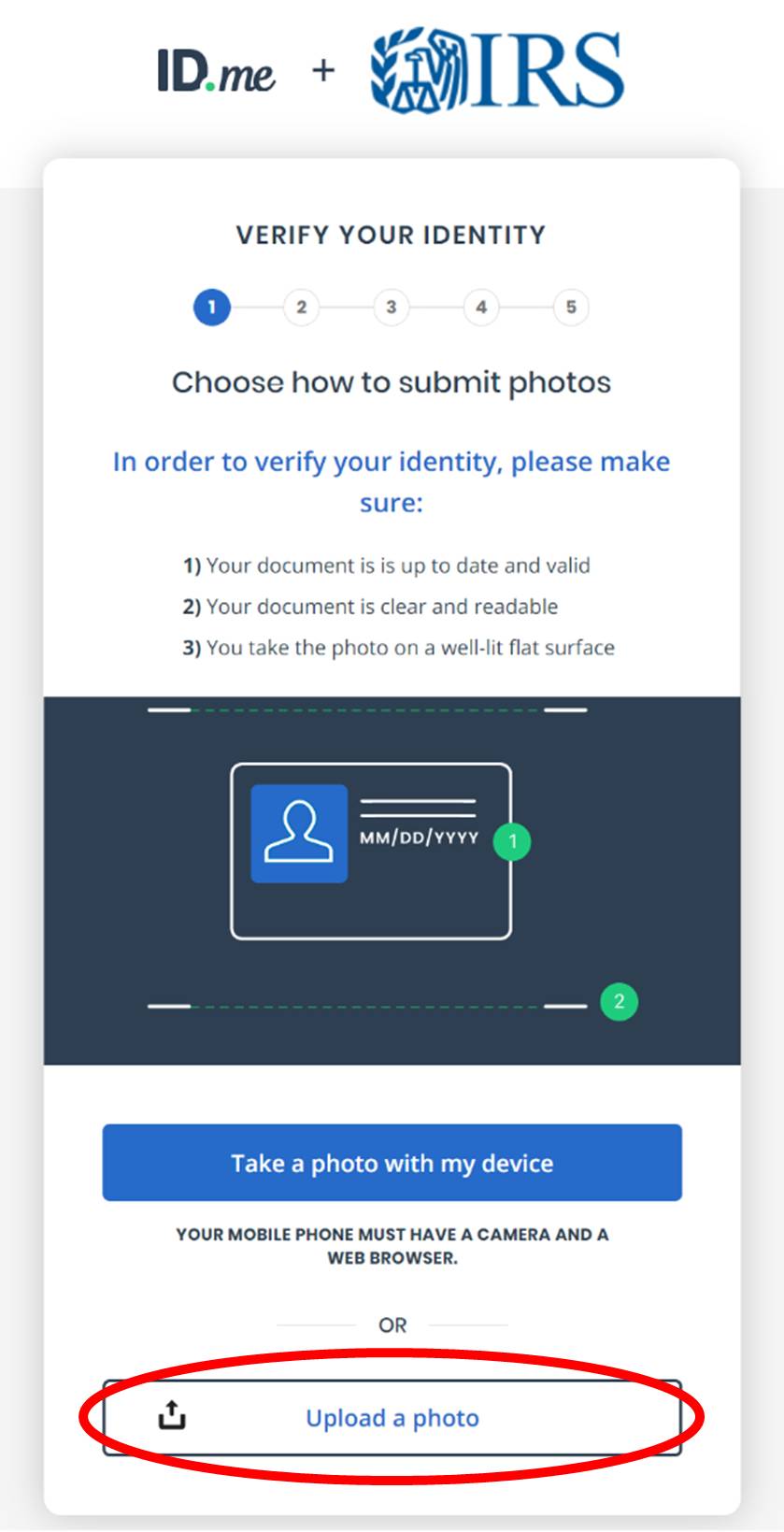On the next page, click the blue box “Choose photo of your driver’s license or state ID.”