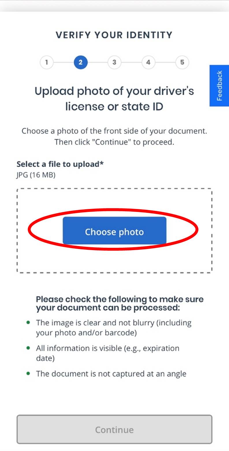 You will be taken to the page below. Click the blue “Choose photo” button and select the photo of your ID. Press “Continue.”
