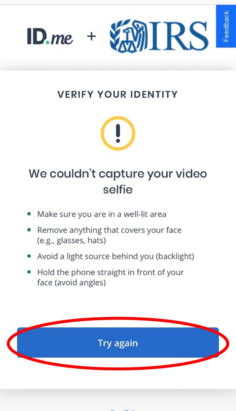 If you receive an error message like the one below, it’s okay. Click the blue “Try again” button. Check to make sure you have good lighting to brighten your face and make sure to hold your phone camera straight in front of you with your face filling the entire oval.