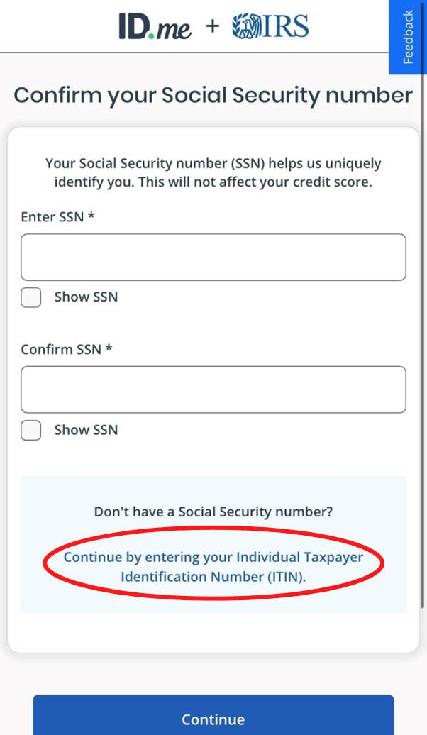 If you are using an Individual Taxpayer Identification Number (ITIN), click the text that says, “Continue by entering your Individual Taxpayer Identification Number (ITIN).”