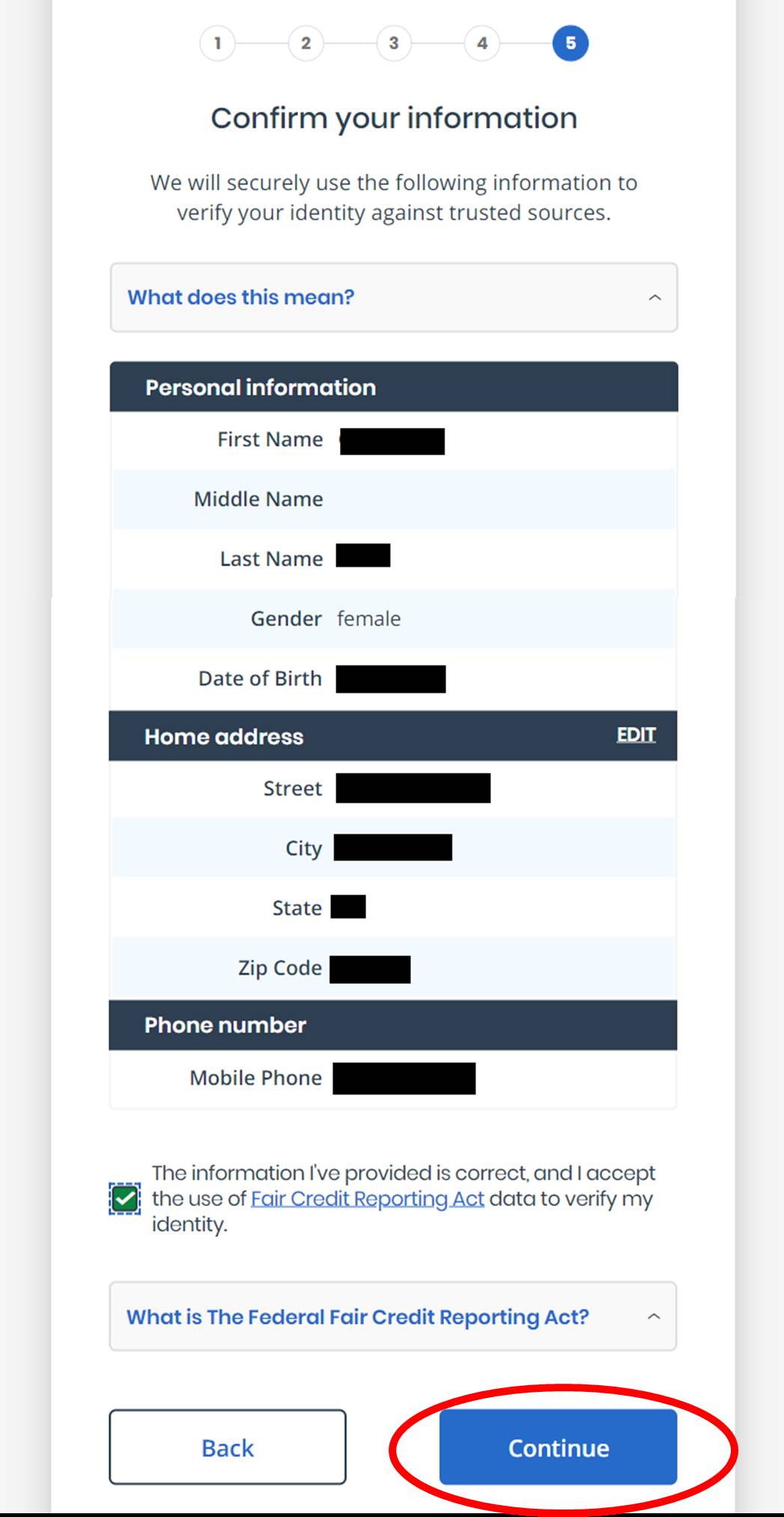 Once you have reviewed your information and made any necessary changes, check the box “The information I’ve provide is correct, and I accept the use of Fair Credit Reporting Act data to verify my identity.” Then, press the blue “Continue” button.