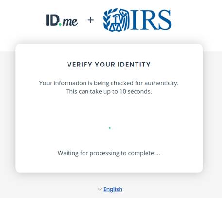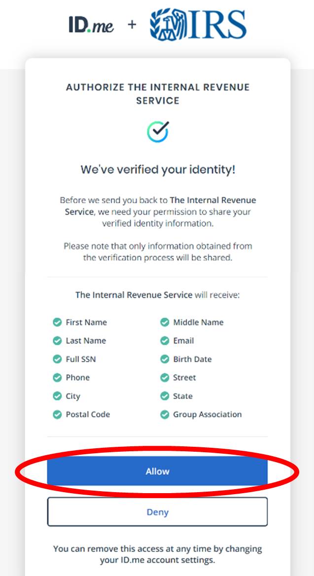 When your identity is successfully verified, you will see this confirmation page. Click the blue “Allow” button to let ID.me to share your verified identity information with the IRS. You can withdraw consent of sharing your verified identity information by changing your ID.me account settings.