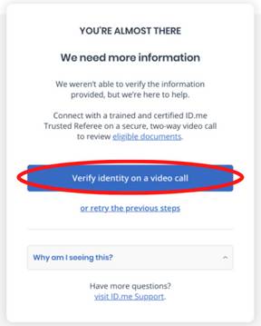 If you see the message below that says, “We need more information” it’s okay. Click the blue “Verify identity on a video call” and skip to step 13 in this guide.