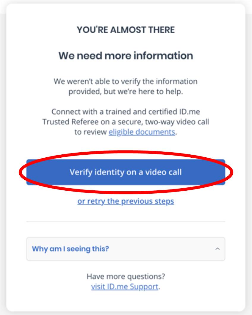 - Allows you to speak directly to an ID.me video agent.