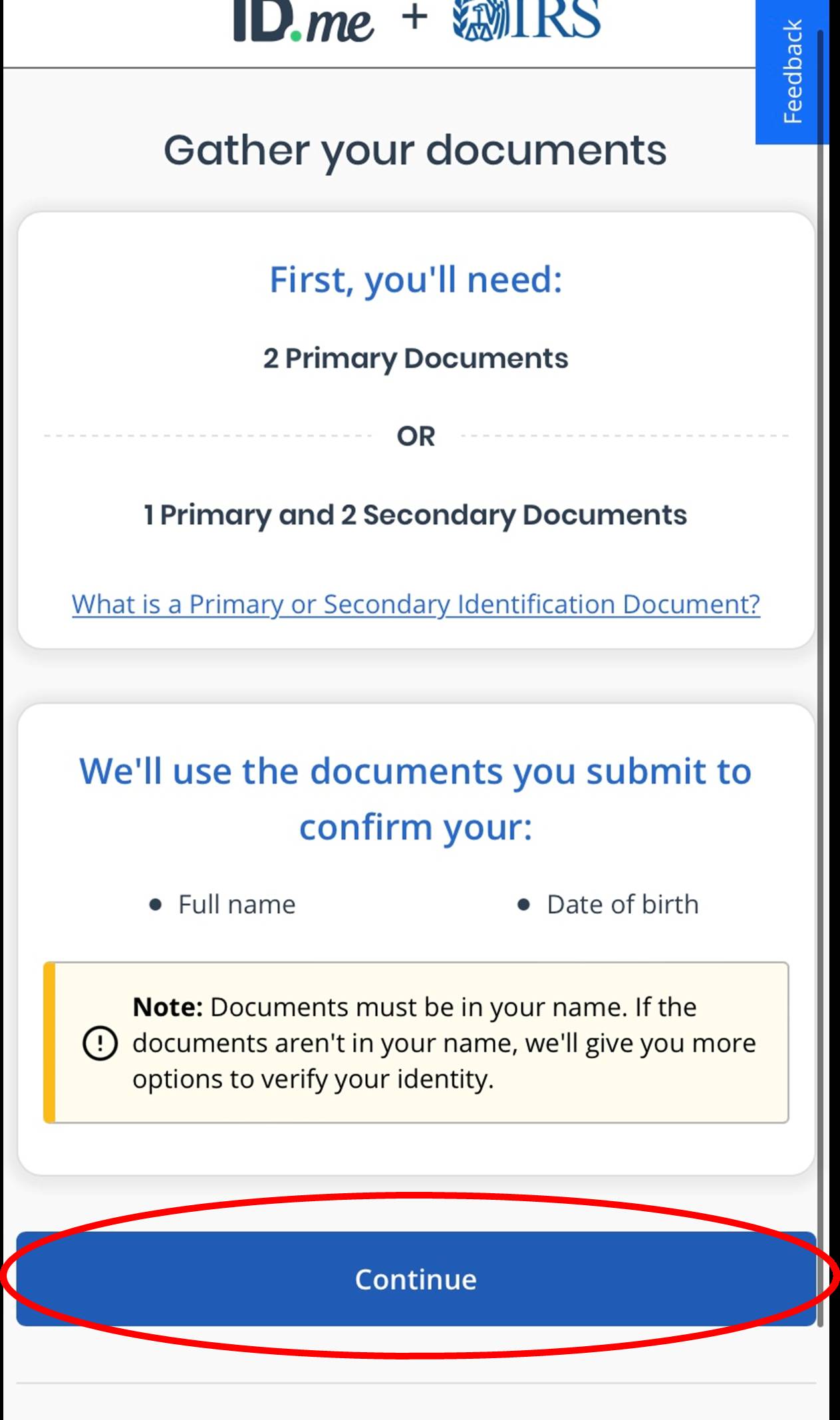 Click the blue “Continue” button when you are ready to upload your documents.