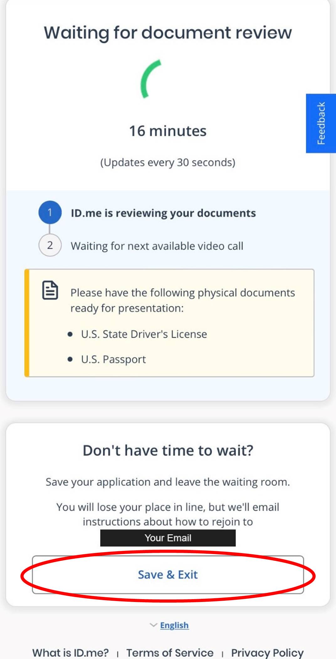 If you do not have time to wait, you can click the white “Save & Exit” button at the bottom of the page to have instructions emailed about how to rejoin the virtual agent call waiting room.