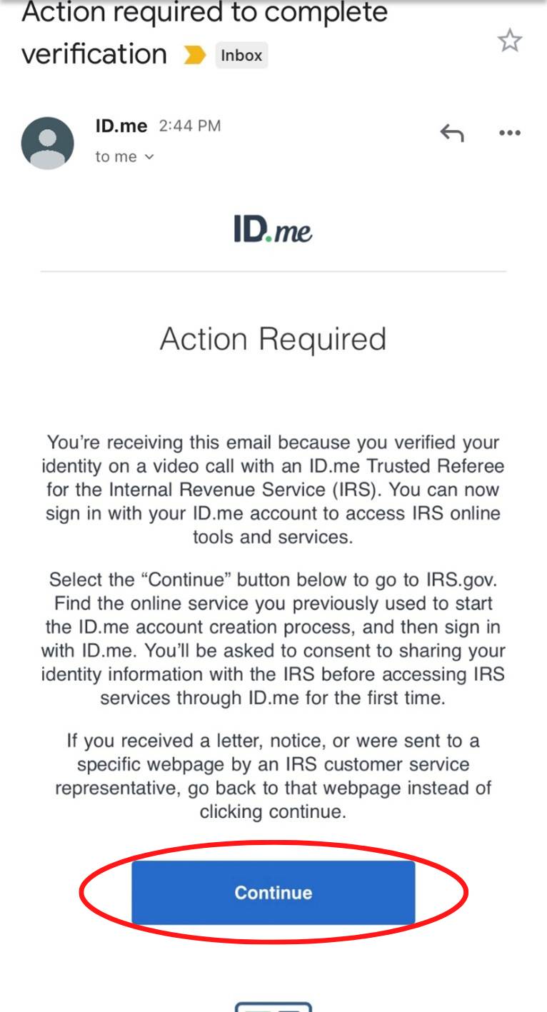 Once your call with the video chat agent has completed, you will receive an email from the sender “ID.me” with the subject “Action required to complete verification.” Read through the information and click the blue “Continue” button.