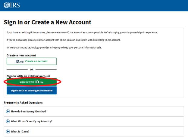 You will be taken to the IRS Sign-In Webpage Click the green “Sign in with ID.me” button and follow the instructions to sign into your account.
