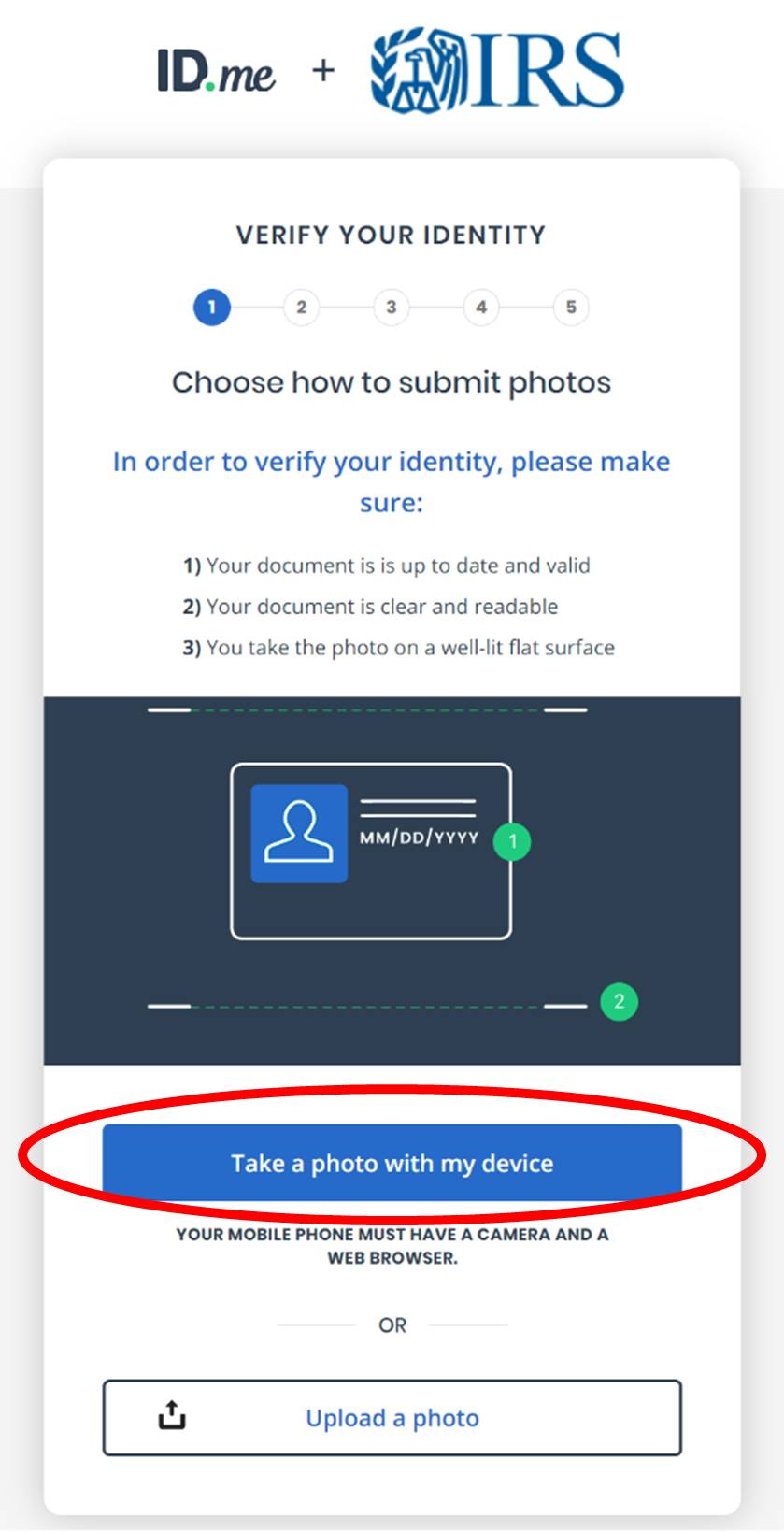 Click the blue “Take a photo with my device” button.